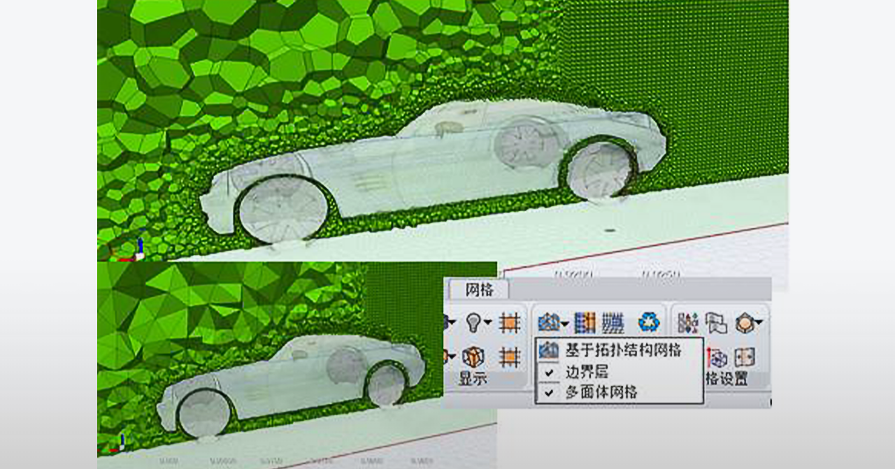通过定义域空间,自动识别域内的实体对象,快速高效创建高质量流体仿真网格及边界层生长。虚拟数字风洞提供静止地面,移动路面,风洞五带系统等多种地面设置。全细节几何建模及网格变形的功能可以更好的还原试验样车,确保仿真与试验的几何一致性。