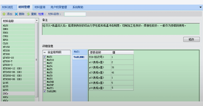 材料编辑工具,可以自定义材料,输入弹性模量、泊松比、密度、屈服强度、极限强度、延伸率、热传导率、热膨胀系数、比热容、介电常数、磁导率、电导率等,支持导出各种求解器格式,提供常用材料参数。