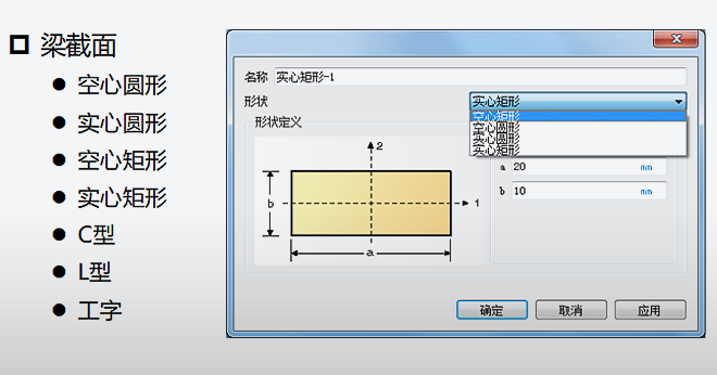 集成了众多标准截面,例如圆、圆环、工字、U型、C型等,还提供了梁截面自定义工具,在平面上绘制特定截面后,计算出梁的截面特性,形成截面卡片。